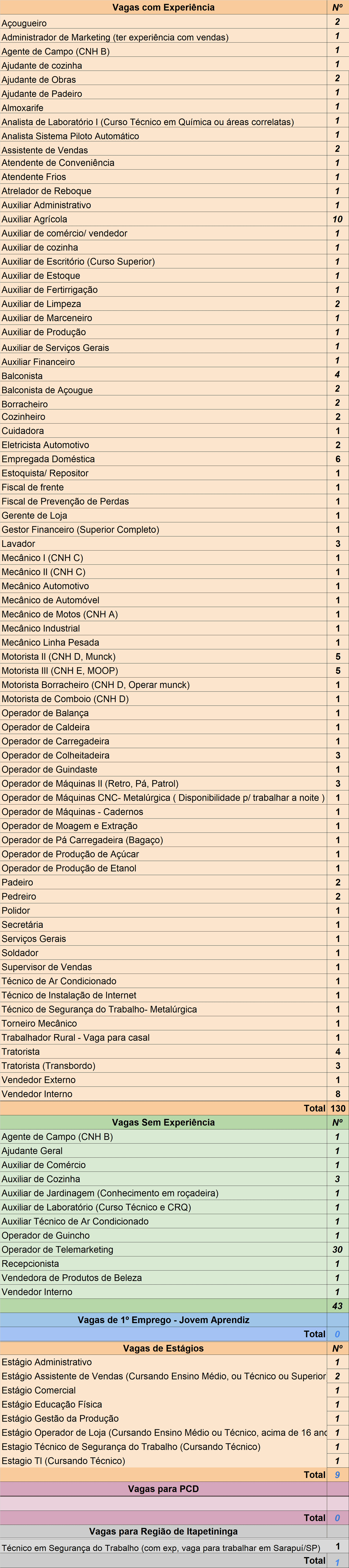 São 43 oportunidades para quem não possui experiência, 130 para candidatos com experiência, 09 para estágio e 01 para região.