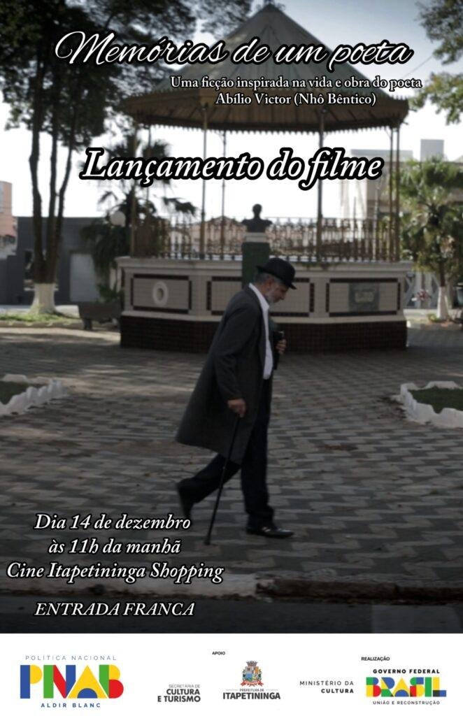 O curta-metragem Memórias de um Poeta será lançado neste domingo, dia 14 de dezembro, às 11 horas, no Cine Itapetininga Shopping, com sessão gratuita e aberta ao público. A obra foi contemplada pela Política Nacional Aldir Blanc, com apoio da Prefeitura Municipal de Itapetininga e da Secretaria Municipal de Cultura.
