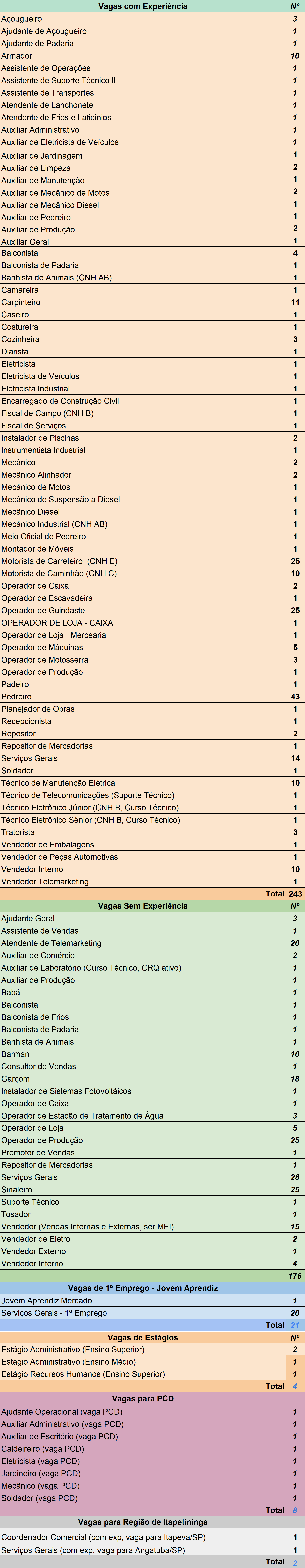 Do total, 176 vagas são destinadas a pessoas sem experiência e 243 exigem experiência prévia. Há ainda 21 vagas para Jovem Aprendiz, quatro para estágio, oito para pessoas com deficiência (PCD) e duas para a região.