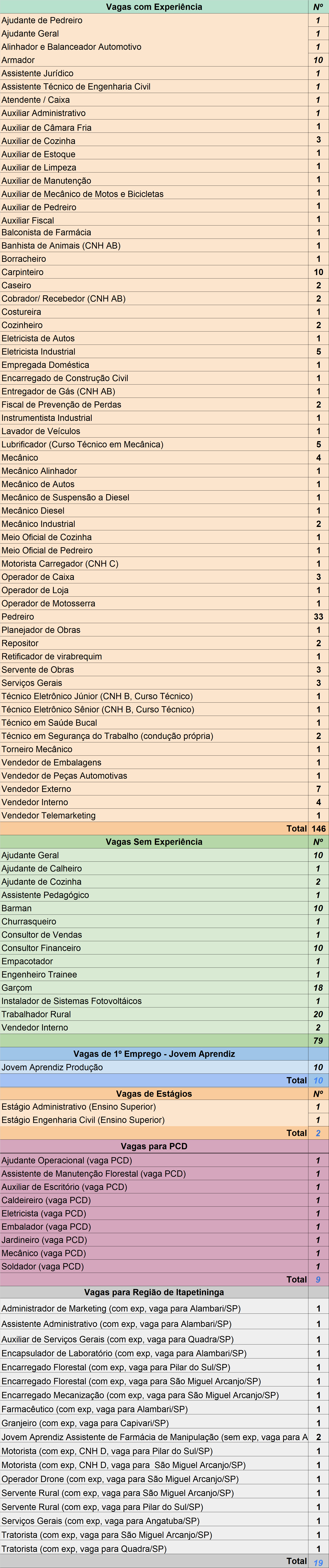 Segundo o órgão, são 79 vagas para candidatos sem experiência, 146 para quem possui experiência, 10 para Jovem Aprendiz, 2 vagas de estágio, 9 destinadas a PCD e 19 para a região.