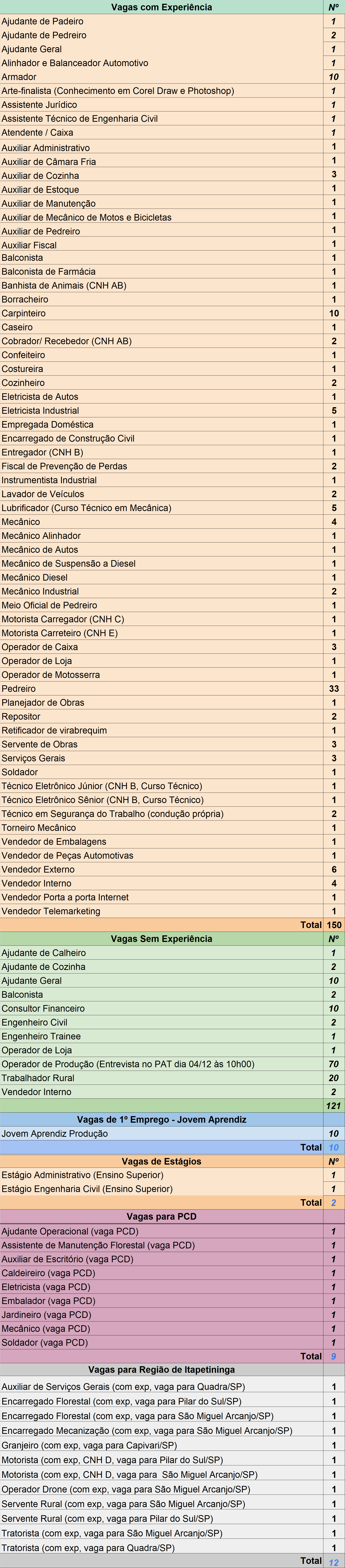 O Posto de Atendimento ao Trabalhador (PAT) de Itapetininga oferece 304 oportunidades de emprego nesta sexta-feira, 5 de dezembro. As vagas são distribuídas entre diferentes perfis e níveis de experiência.