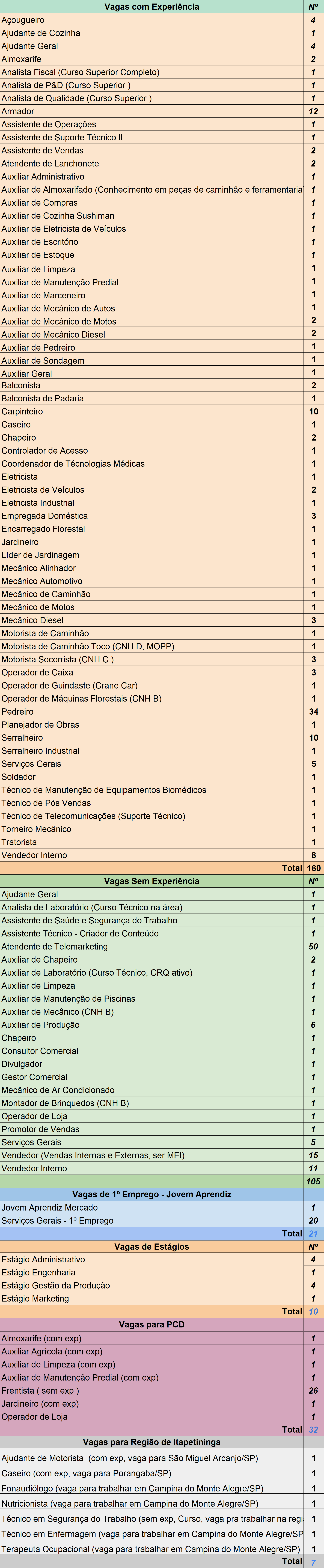As vagas estão distribuídas da seguinte forma: 105 sem exigência de experiência, 160 para candidatos com experiência, 21 para jovem aprendiz, 10 de estágio, 32 destinadas a pessoas com deficiência (PCD) e 7 na região.