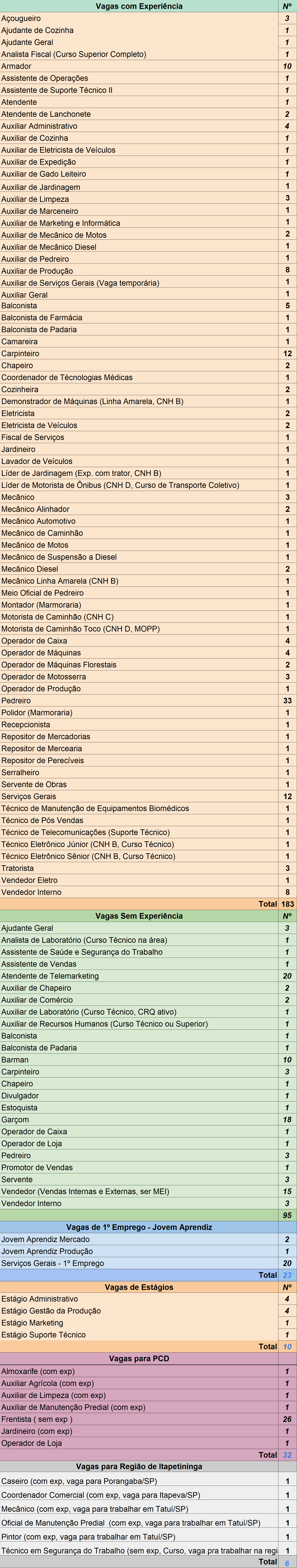 As vagas estão distribuídas da seguinte forma: 95 para candidatos sem experiência, 183 para pessoas com experiência, 23 para jovem aprendiz, 10 para estágio e 32 para pessoas com deficiência (PCD). Há ainda seis vagas disponíveis em cidades da região.