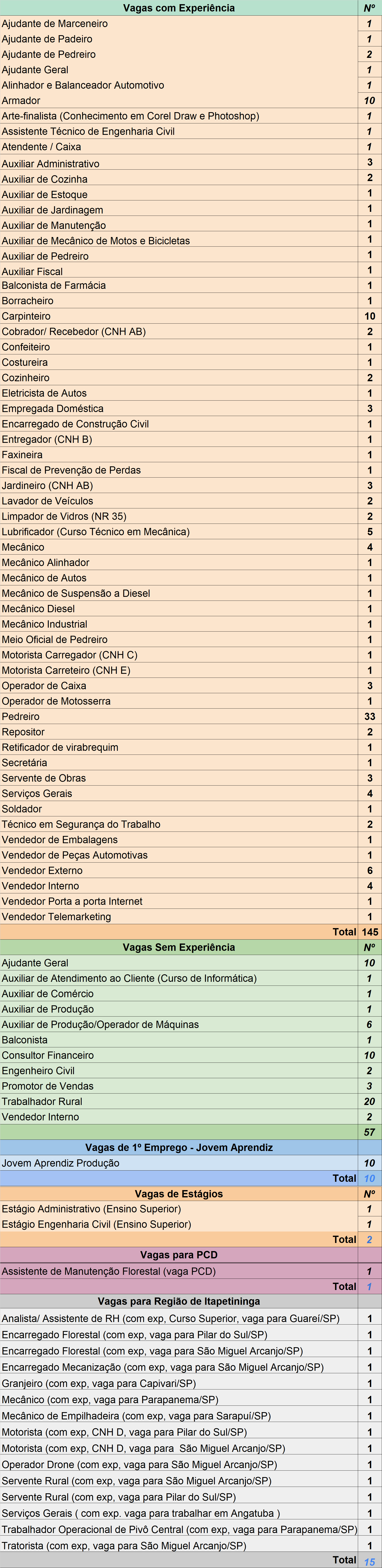 De acordo com o PAT, são 57 vagas para candidatos sem experiência, 145 com exigência de experiência, 10 para jovem aprendiz, duas para estágio, uma para pessoa com deficiência e 15 vagas destinadas à região.