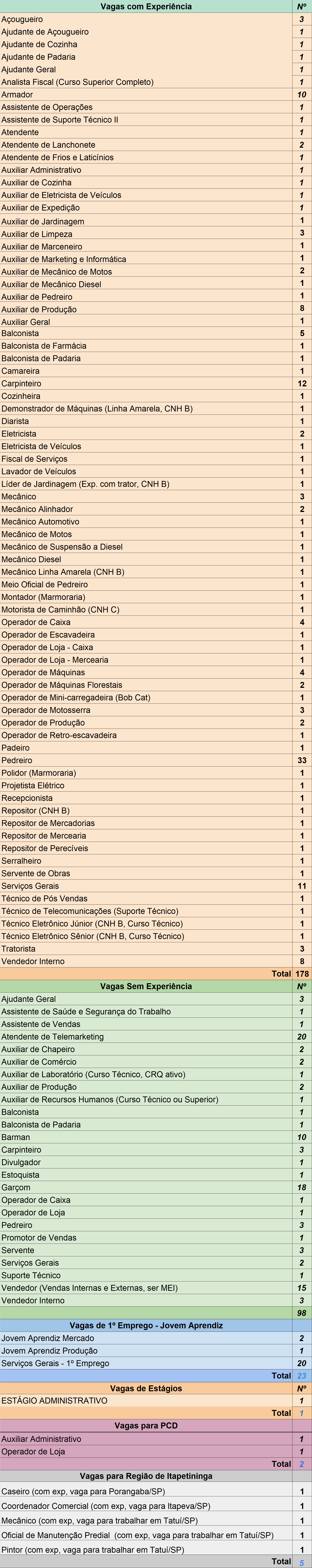 Do total, 98 vagas não exigem experiência prévia, 178 requerem experiência, 23 são para Jovem Aprendiz, uma para estágio, duas para pessoas com deficiência (PCD) e cinco para a região.