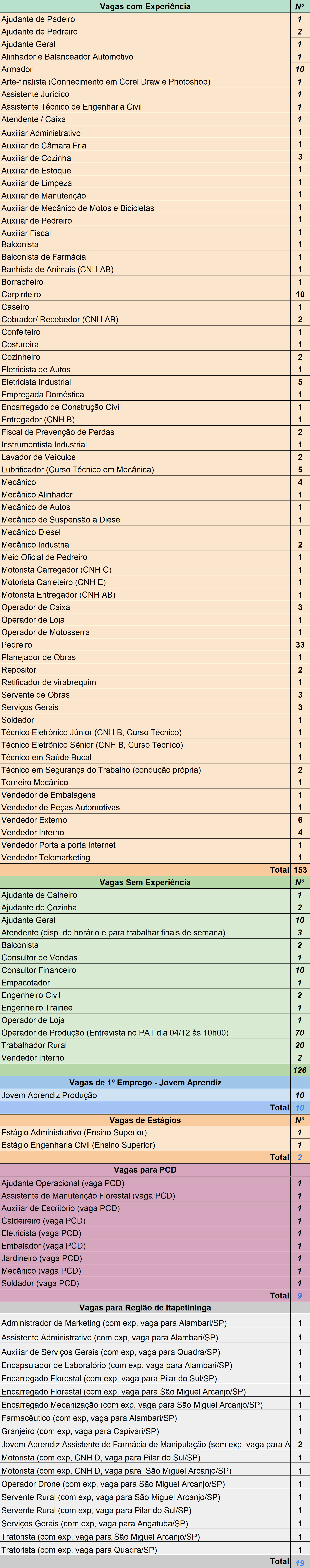 O Posto de Atendimento ao Trabalhador (PAT) de Itapetininga disponibiliza 319 vagas de emprego nesta quarta-feira, 3 de dezembro. As oportunidades abrangem diferentes perfis profissionais e níveis de experiência.