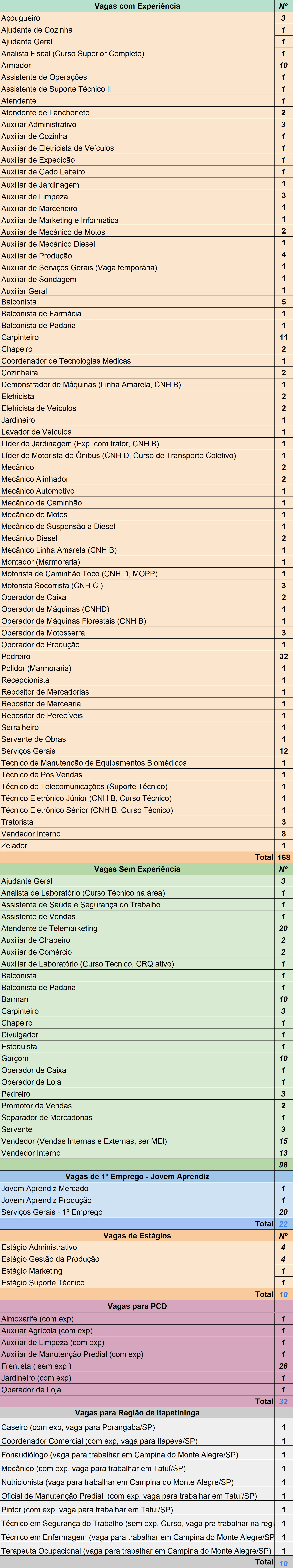 Do total, 98 vagas são para pessoas sem experiência, 168 exigem experiência prévia, 22 são destinadas a jovens aprendizes, 10 para estágios e 32 para pessoas com deficiência (PCD). Outras 10 vagas estão abertas em cidades da região.