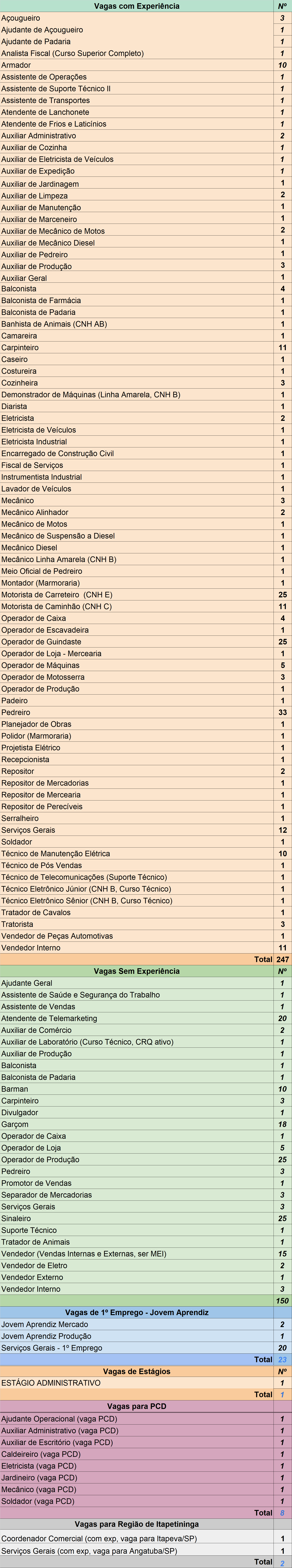 De acordo com o órgão, são 150 vagas sem exigência de experiência, 247 para candidatos com experiência, 23 para Jovem Aprendiz, uma de estágio, oito para pessoas com deficiência (PCD) e duas na região.