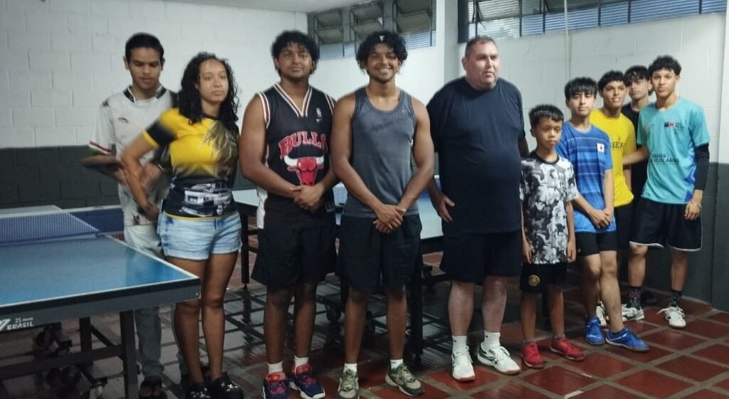 A atividade ocorreu no período da noite e contou com a participação de alunos que já frequentam as aulas de tênis de mesa no ginásio. Gabriel participou da aula utilizando uma raquete recebida da mãe, Karina, e realizou atividades junto ao grupo.