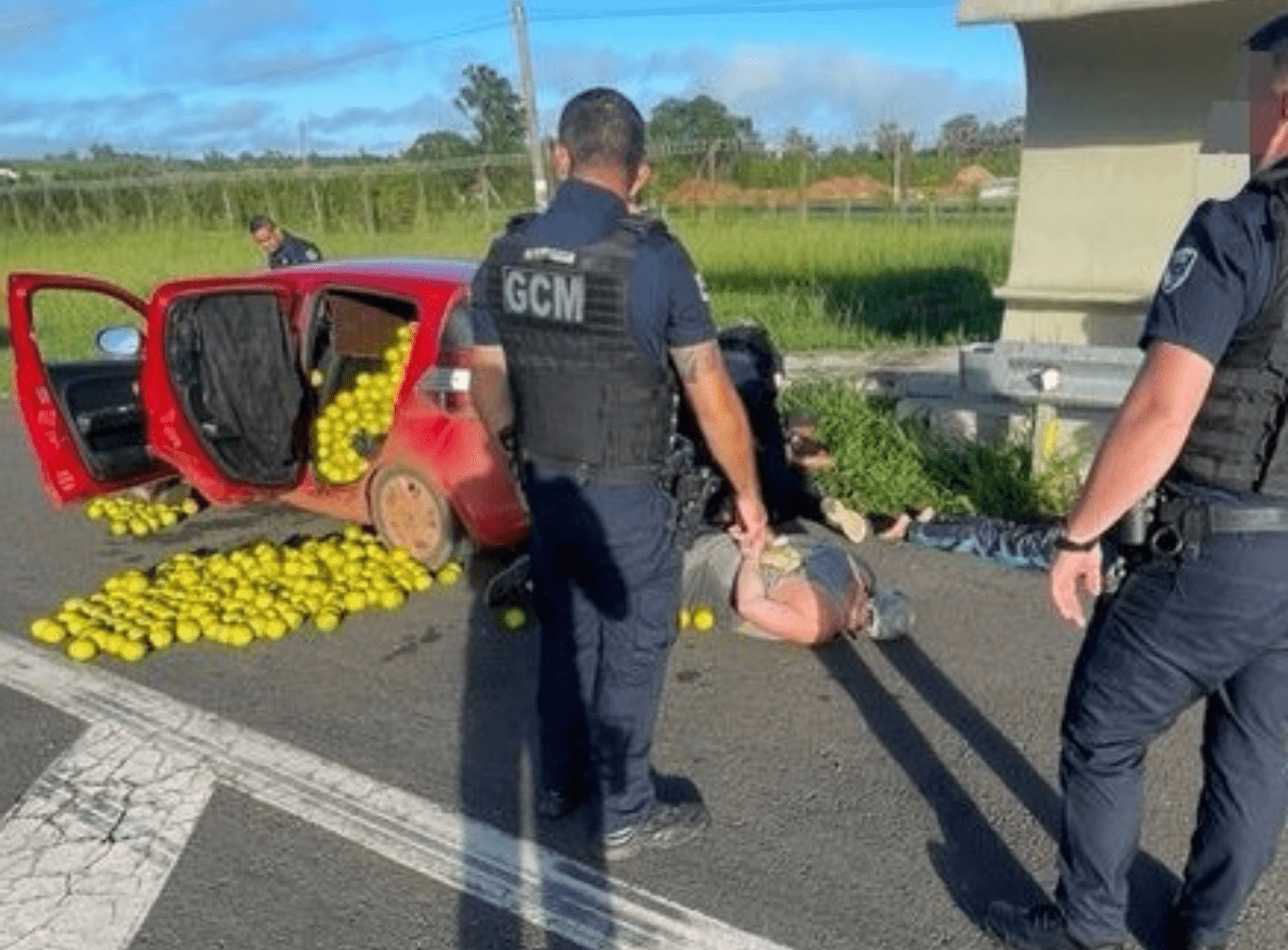 No interior do automóvel estavam três homens. Durante a revista pessoal, nada de ilícito foi encontrado com dois dos suspeitos. Com o terceiro, foram localizados três pinos contendo substância análoga à cocaína e R$ 50 em dinheiro. Na vistoria do veículo, os agentes encontraram cerca de 550 quilos de laranja, distribuídos em 25 caixas, além de R$ 232,15 em espécie. A carga foi identificada como proveniente da empresa furtada.