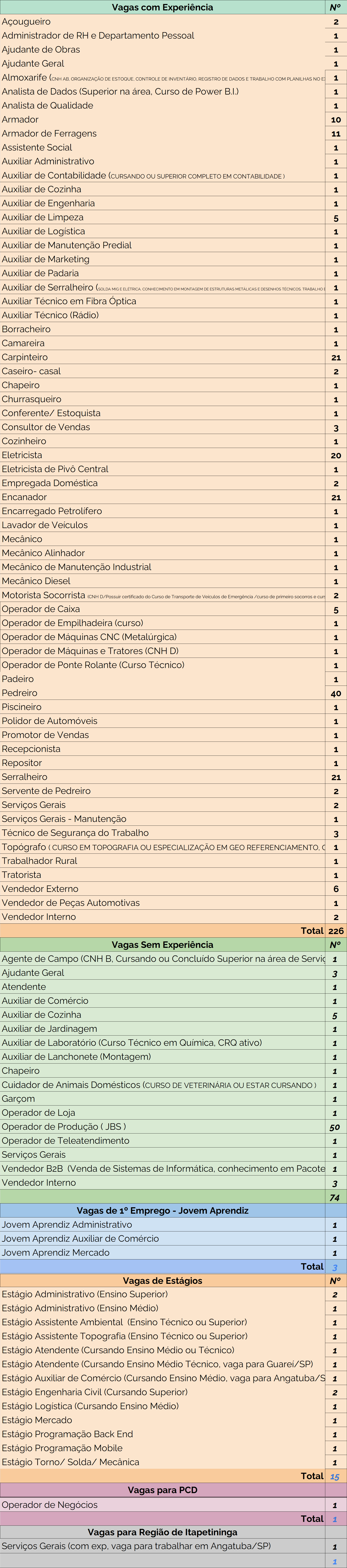 Do total, 74 vagas são para candidatos sem experiência e 226 para quem já possui experiência. Também há três vagas para jovem aprendiz, 15 para estágio, uma destinada a pessoa com deficiência e uma para atuação na região.
