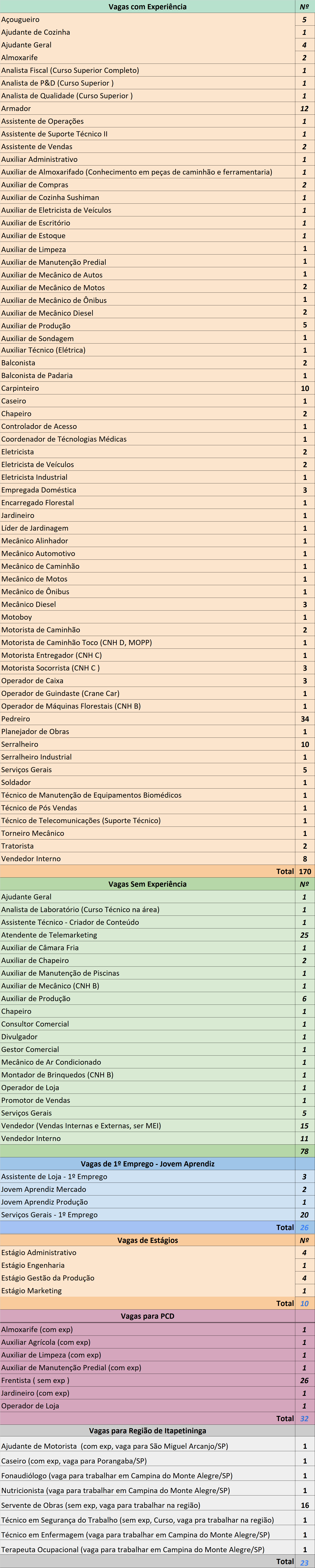 Do total, 78 vagas são para candidatos sem experiência e 170 para quem já possui experiência na função. Há ainda 26 vagas para Jovem Aprendiz, 10 para estágio, 32 para pessoas com deficiência (PCD) e 23 vagas em cidades da região.