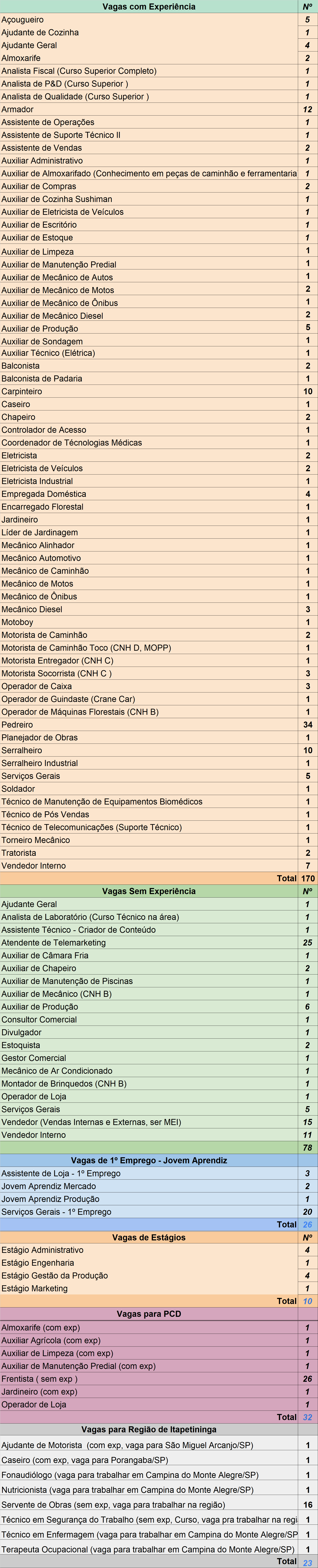 Das vagas abertas, 78 não exigem experiência prévia, 170 são para profissionais com experiência, 26 para Jovem Aprendiz, 10 de estágio, 32 destinadas a pessoas com deficiência (PCD) e 23 para a região.