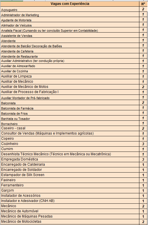 Segue abaixo a relação completa das vagas disponíveis: