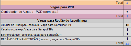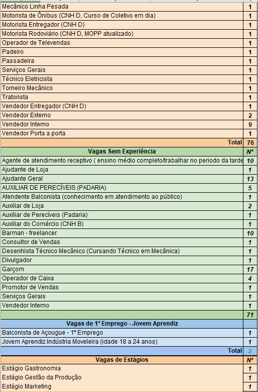 São 76 vagas que não exigem experiência, 71 vagas para pessoas com experiência, 02 vagas para Jovem Aprendiz, 03 para estágio, 01 para PCD e outras 43 para funções em cidades na região de Itapetininga.