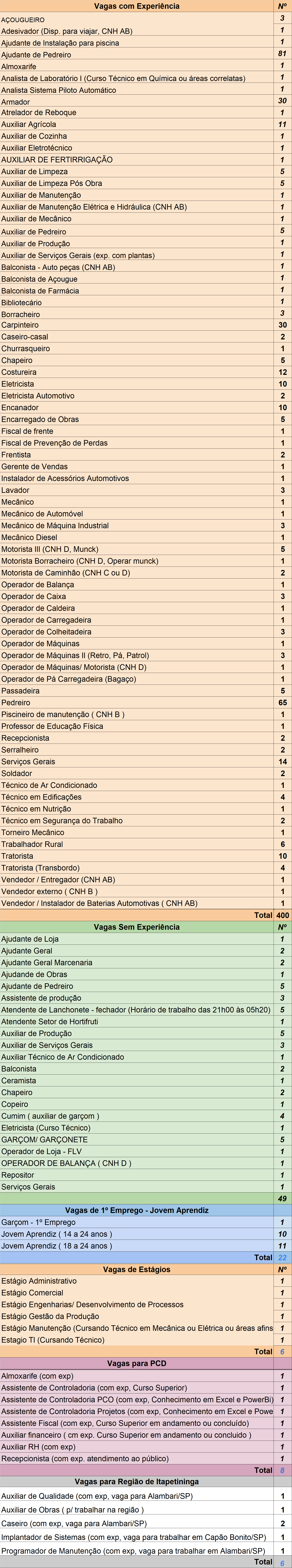 São 49 oportunidades para quem não possui experiência, 400 para candidatos com experiência, 22 para Jovem Aprendiz, 06 para estágio, 08 para candidatos com deficiência e 6 para região.