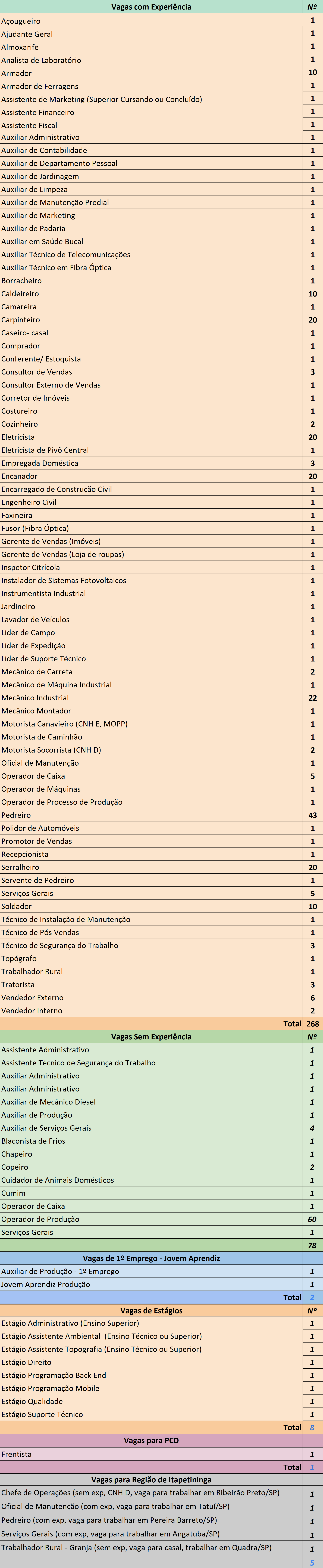 Do total, 78 vagas não exigem experiência e 268 são destinadas a candidatos com experiência prévia. Também há 2 vagas para jovem aprendiz, 8 para estágio, 1 vaga para pessoa com deficiência (PCD) e 5 oportunidades para atuação na região.