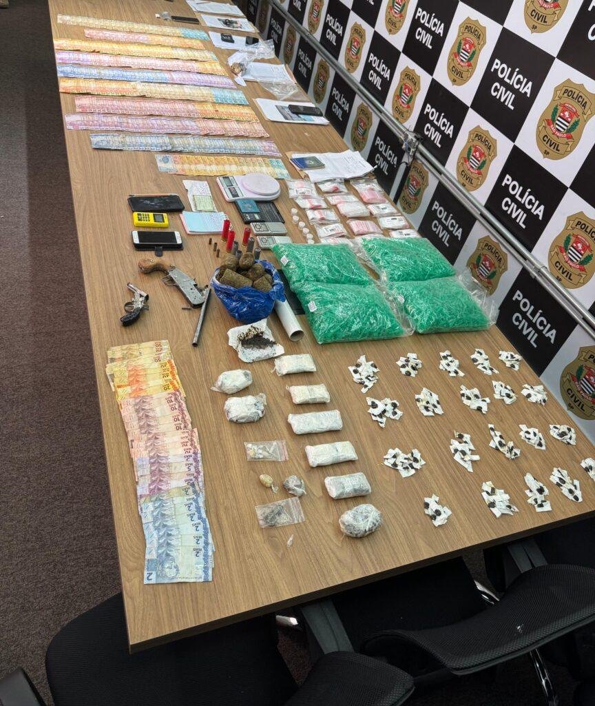 Segundo a Polícia Civil, os suspeitos foram surpreendidos armazenando maconha, crack e cocaína, além de balanças de precisão, embalagens utilizadas para acondicionamento de entorpecentes e dinheiro sem origem comprovada. Em um dos endereços, os agentes localizaram duas armas de fogo, uma delas com numeração suprimida.